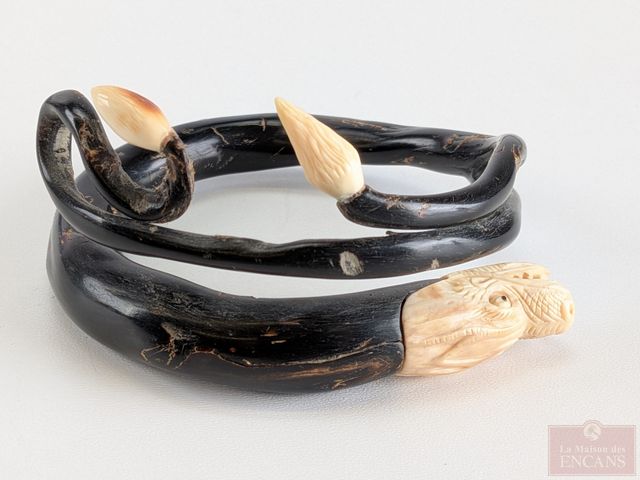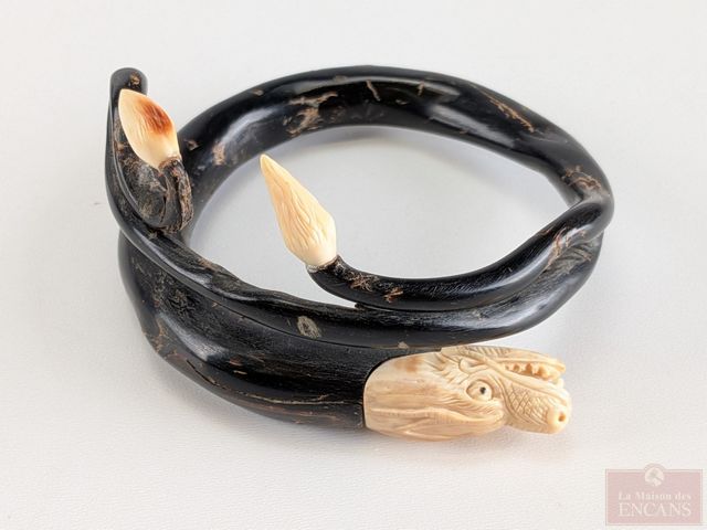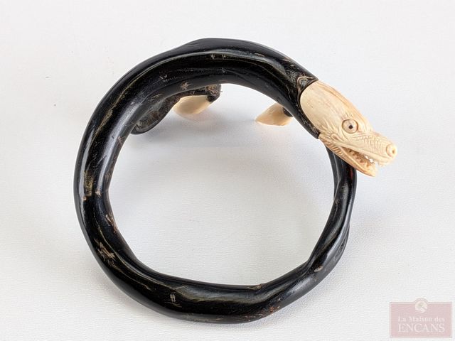 Lot # 211 - Bracelet chinois sculpté sur corne avec éléments sculptés sur os, représentant un dragon, datant du début du 20eme siècle et mesurant 3 pouces de diamètre