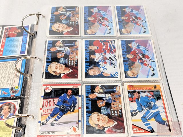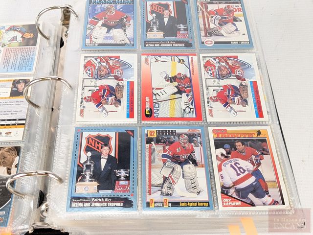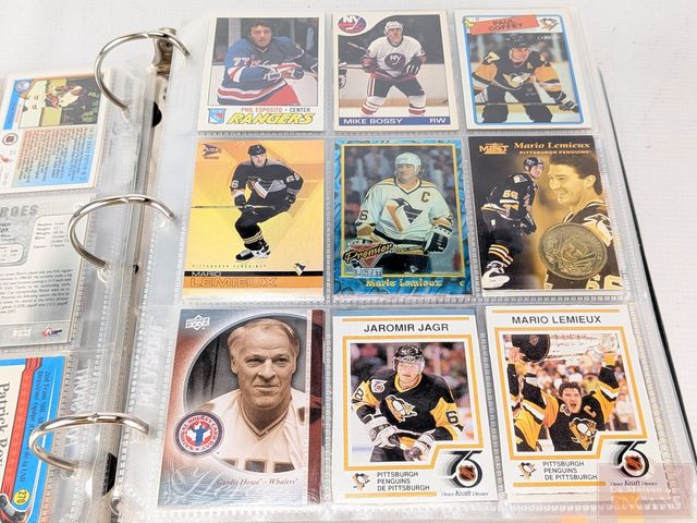 Gros album de cartes de hockey, dont Guy Lafleur, Gordie Howe, Maurice Richard, Patrick Roy, Jaromir Jager, Mario Lemieux et Joe Sakic