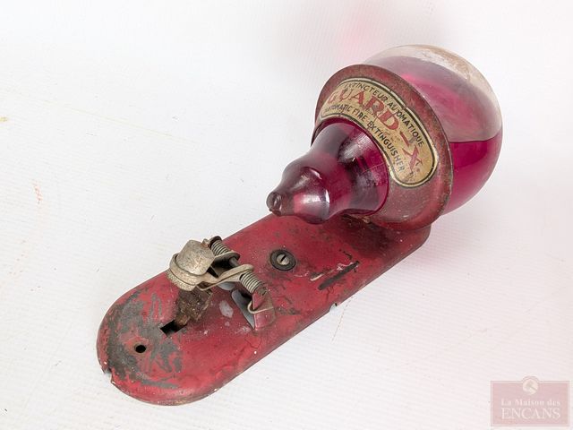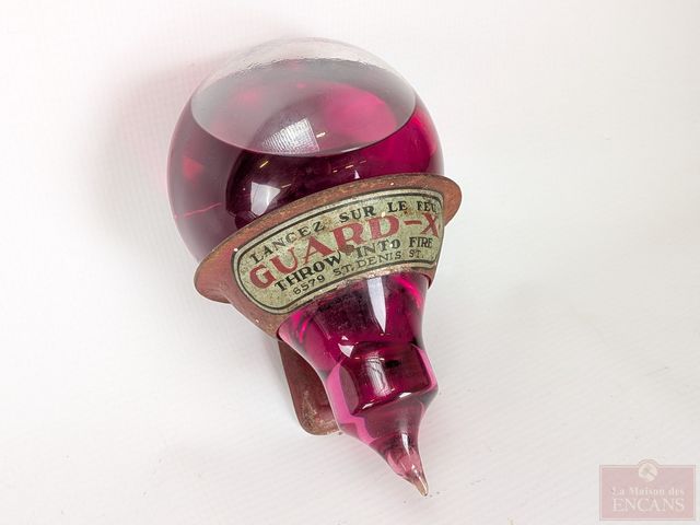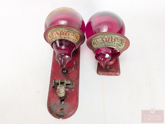Anciennes ampoules d'extincteur Guard X avec leur support, mesurant 6 pouces de hauteur