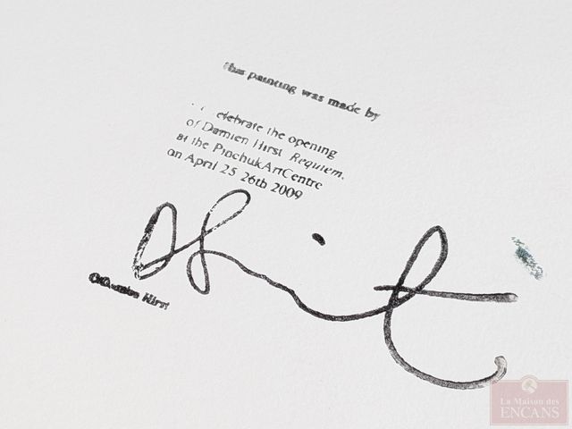 Lot # 192 - Damien HIRST- Œuvre sur papier signée, réalisée lors du vernissage de l'exposition Requiem le 26 avril 2009, mesurant 28x19 pouces