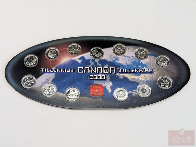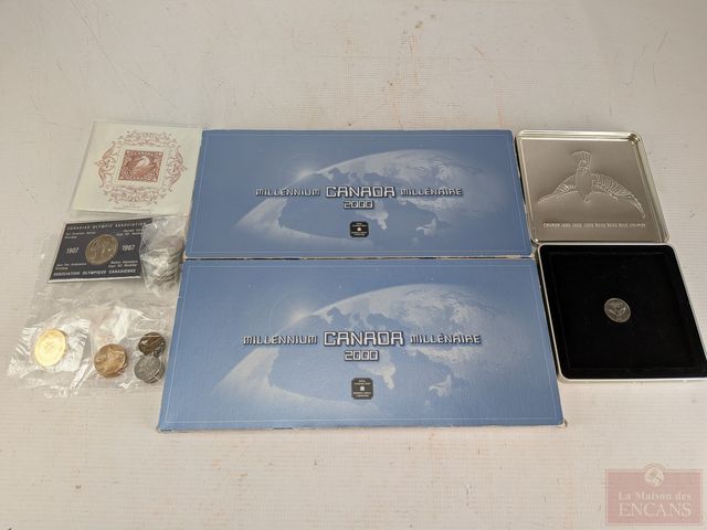 Lot # 170 - Lot numismatique canadien comprenant deux ensembles du millénaire, pièce de vingt-cinq sous 2000 de la Paix, coffret millénaire timbre et vingt-cinq sous, pièces de cinq sous des années 1930, pièces de vingt-cinq sous des années 2000, ainsi que deux jetons des années 1960