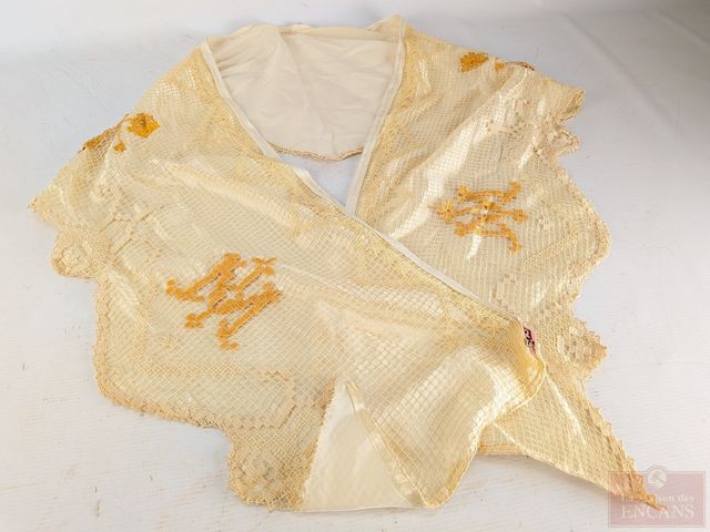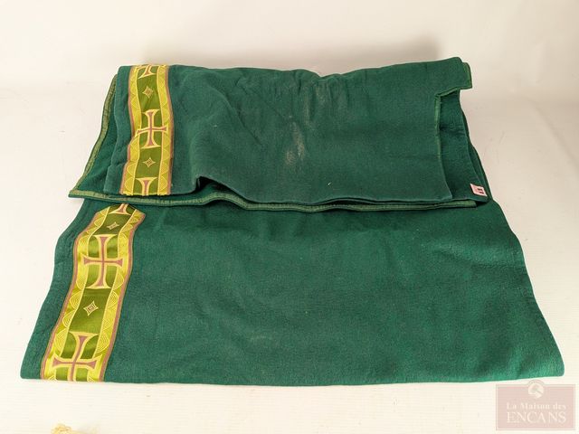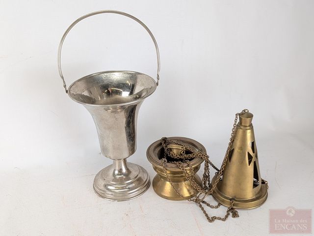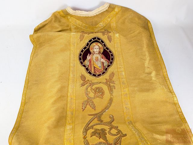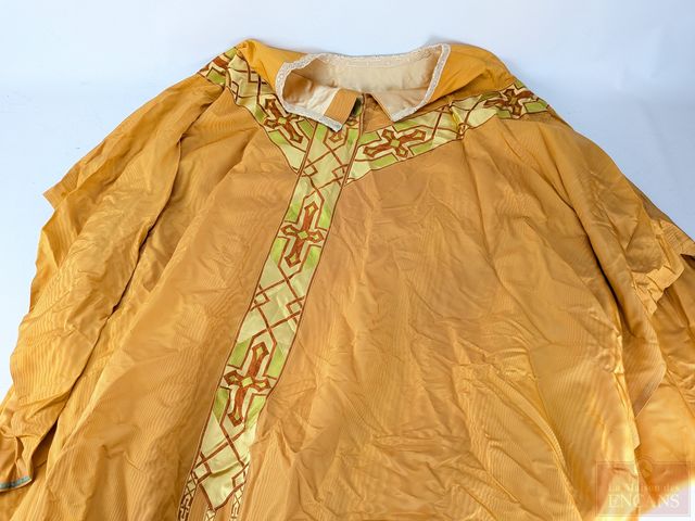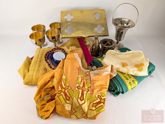 Lot # 163 - Lot religieux comprenant chasuble finement brodé avec fil d'or, calices, encensoir, repose-bible et autres