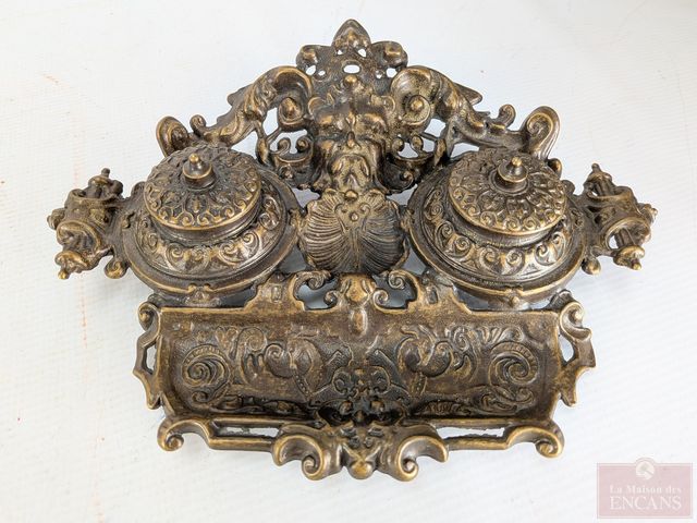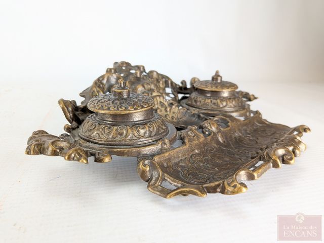 Encriers et porte-plume en laiton, mesurant 10 pouces de largeur