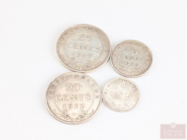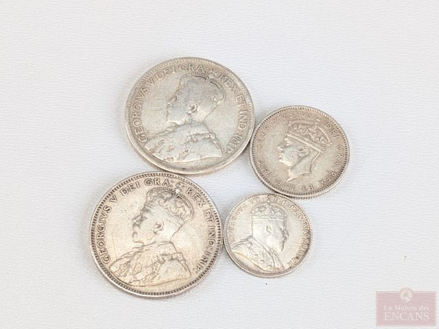 Lot de pièces canadiennes en argent, comprenant pièce de cinq sous 1934, pièce de dix sous 1938, vingt-cinq sous 1919 et vingt sous 1912