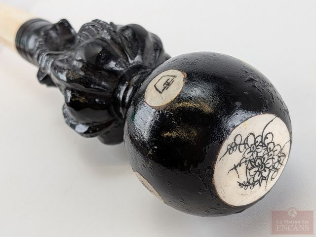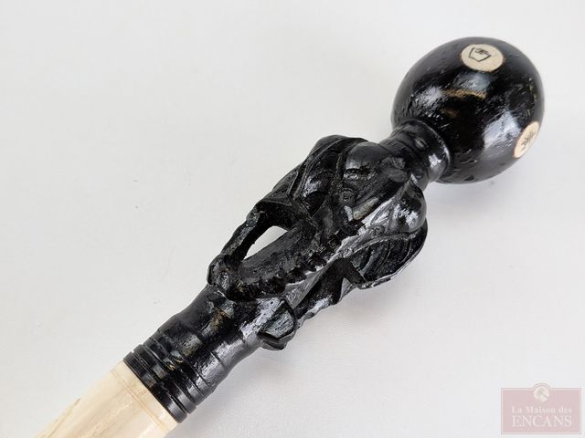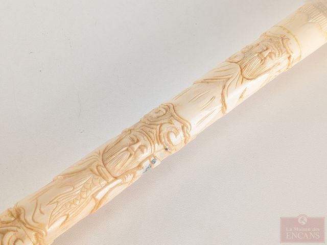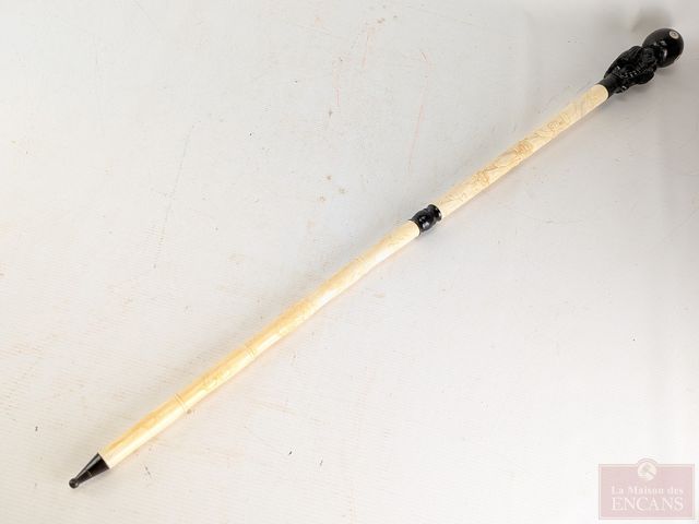 Lot # 216 - Canne sculptée sur os, ornée de représentations des divinités San Xing Fu (bonheur) Lu (prospérité) et Situ (longévité), de dragons et d'éléphants, datant du début du 20eme siècle et mesurant 37 pouces de hauteur