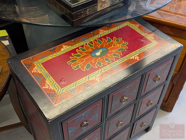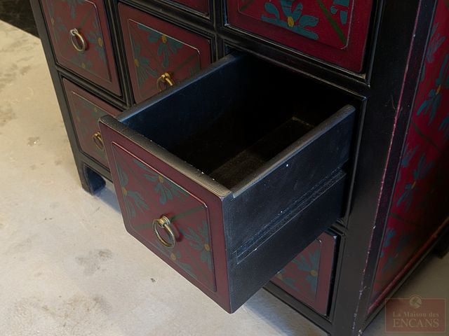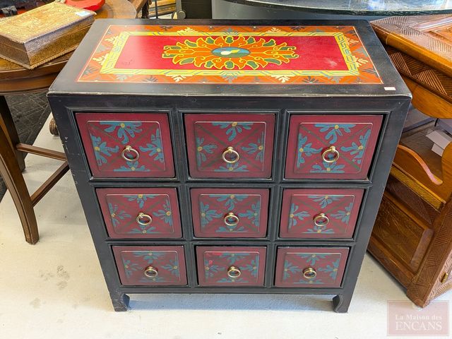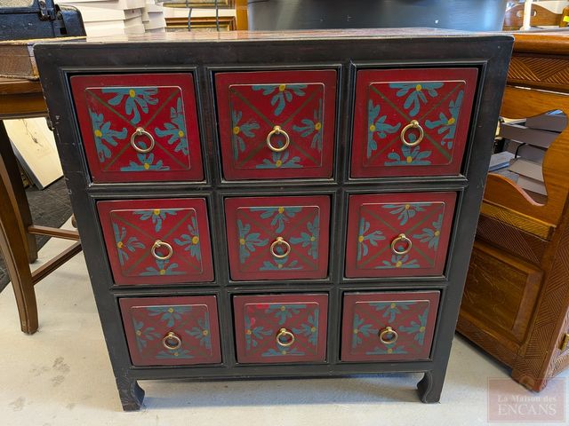 Lot # 123 - Meuble de rangement oriental à neuf tiroirs, fait en bois avec poignées en laiton, peint à la main et mesurant 26x28x14 pouces