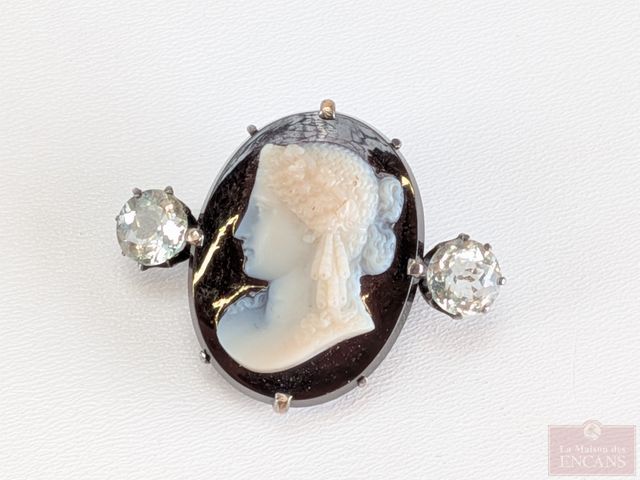 Lot # 219 - Broche camée finement sculpté, monté sur onyx et argent avec agrafe en or 18k, mesurant 1 pouce de hauteur