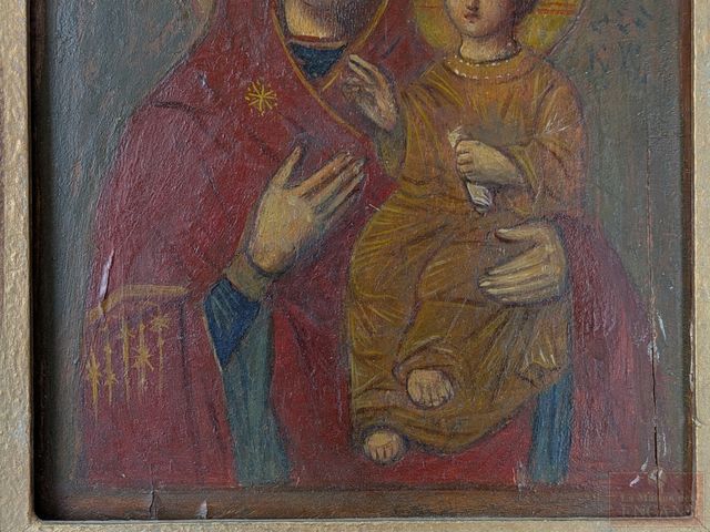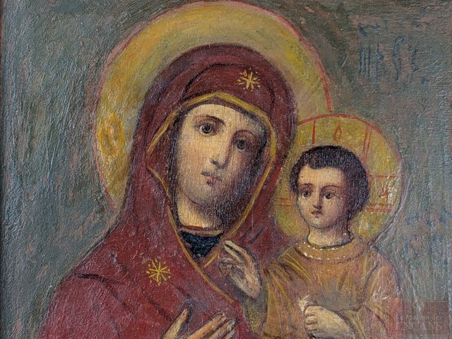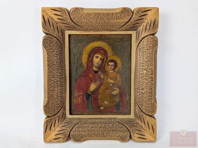 Lot # 188 - Icône religieuse orthodoxe peinte à la tempera sur bois, représentant la vierge à l'enfant, datant du début du 19eme siècle et mesurant 6.25x4.75 pouces