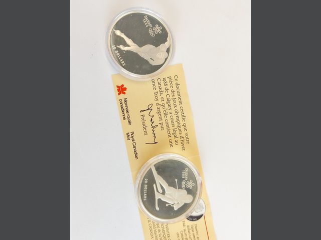 Lot # 149 - Deux pièces de 20$ Calgary 1988 de une once d'Argent pur chacune Ski alpin et Patinage de vitesse - Sans taxes SOLD