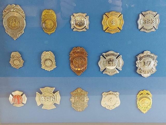 Lot # 119 - Belle collection d'écussons et d'insignes authentiques des pompiers - présenté dans un cadre mesurant 11x23 pouces SOLD