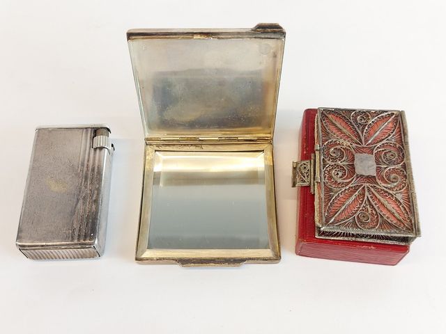 Lot # 157 - Ancien petit agenda de poche en argent filigrane avec son boitier d'origine circa 1920 mesurant 2.25 pouces ainsi qu'un poudrier ancien 2.25 pouces circa 1930 en argent massif avec médaillon en or ; ainsi qu'un ancien briquet Flaminaire en argent massif mesurant 2.25 pouces VENDU