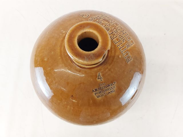 Lot # 157 - Grande cruche en grès 4 galons 1921 A.W. Buchan and Co. Portobello Scotland - ébréchure sur le goulot - mesurant 17 pouces de hauteur VENDU