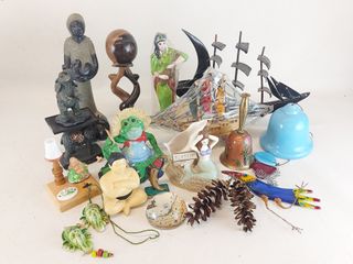 #22 Lot varié comprenant un bateau fait en corne de boeuf - figurine sur pierre à savon - une clochette - des figurines - et autres