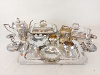 | #38 | Ensemble de service en métal argenté comprenant théière cafetière crémier sucrier ainsi qu'un beurrier. La cafetière mesurant 9 pouces de hauteur Ensemble de service en métal argenté comprenant théière cafetière crémier sucrier ainsi qu'un beurrier. La cafetière mesurant 9 pouces de hauteur | SOLD – CAD$ 55.00 | |
