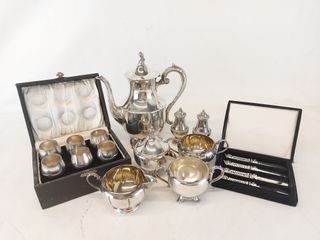 ![]() | #31 | Lot d'argenterie anglaise comprenant théière, crémiers, sucriers et une paire de salière et poivrière ainsi qu'un ensemble de couteaux à beurre dans son coffret et autre Lot d'argenterie anglaise comprenant théière, crémiers, sucriers et une paire de salière et poivrière ainsi qu'un ensemble de couteaux à beurre dans son coffret et autre | SOLD – CAD$ 40.00 |