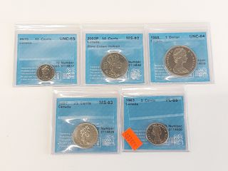 ![]() | #63 | Lot de pièces de monnaies canadiennes gradées dont 5 sous 1963 PL65, 10 sous 1970 UNC65, 50 sous 2022 PMS62, un dollar 1968 UNC64 et 25 sous 1987 MS63 Lot de pièces de monnaies canadiennes gradées dont 5 sous 1963 PL65, 10 sous 1970 UNC65, 50 sous 2022 PMS62, un dollar 1968 UNC64 et 25 sous 1987 MS63 | SOLD – CAD$ 30.00 |