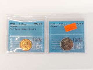 ![]() | #80 | Deux pièces de monnaie canadiennes gradées dont 1 sous 1965 MS64 et 5 sous 1972 UNC64 Deux pièces de monnaie canadiennes gradées dont 1 sous 1965 MS64 et 5 sous 1972 UNC64 | SOLD – CAD$ 20.00 |