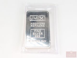 | #223 | Lingot de dix onces d'argent pur 999 Johnson Matthew, scellé, sans taxes Lingot de dix onces d'argent pur 999 Johnson Matthew, scellé, sans taxes | SOLD – CAD$ 720.00 | |