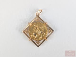 | #214 | Pièce française en or 900, représentant Jeanne D'arc, montée sur pendentif en or 14k et mesurant plus de 1.5 pouces Pièce française en or 900, représentant Jeanne D'arc, montée sur pendentif en or 14k et mesurant plus de 1.5 pouces | SOLD – CAD$ 390.00 | |