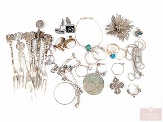 | #198 | Lot de bijoux et fourchettes à condiment, le tout en argent, la chaine mesurant 26 pouces de longueur Lot de bijoux et fourchettes à condiment, le tout en argent, la chaine mesurant 26 pouces de longueur | SOLD – CAD$ 140.00 | |