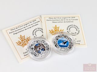 | #213 | Deux pièces canadiennes de trois dollars 2019 en argent pur 9999, Observation de baleine et Dégustation de sirop d'érable, encapsulées avec certificats, sans taxes Deux pièces canadiennes de trois dollars 2019 en argent pur 9999, Observation de baleine et Dégustation de sirop d'érable, encapsulées avec certificats, sans taxes | SOLD – CAD$ 80.00 | |