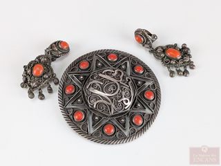 | #230 | Grand pendentif berbère en argent mesurant 2.5 pouces, ainsi que paire de boucles d'oreilles, le tout serti de corail Grand pendentif berbère en argent mesurant 2.5 pouces, ainsi que paire de boucles d'oreilles, le tout serti de corail | SOLD – CAD$ 55.00 | |