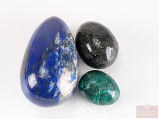 | #210 | Trois œufs sculptés sur lapis-lazuli, malachite et labradorite, le plus grand mesurant 3 pouces Trois œufs sculptés sur lapis-lazuli, malachite et labradorite, le plus grand mesurant 3 pouces | SOLD – CAD$ 30.00 | |
