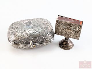 ![]() | #70 | Pilulier art-nouveau en métal argenté, datant des années 1920 et mesurant 4 pouces, ainsi qu'un porte-allumettes art-nouveau en argent, mesurant 2.5 pouces Pilulier art-nouveau en métal argenté, datant des années 1920 et mesurant 4 pouces, ainsi qu'un porte-allumettes art-nouveau en argent, mesurant 2.5 pouces | |