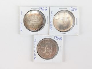 ![]() | #62 | Trois pièces canadiennes d'un dollar en argent 1958, 1962 et 1967 Trois pièces canadiennes d'un dollar en argent 1958, 1962 et 1967 | |