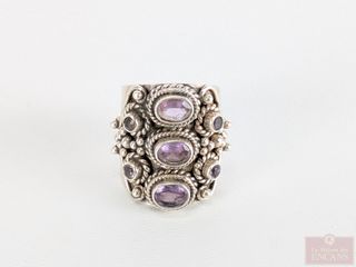 ![]() | #101 | Bague tibétaine en argent sertie de multiples améthystes, de taille 8.5 Bague tibétaine en argent sertie de multiples améthystes, de taille 8.5 | |