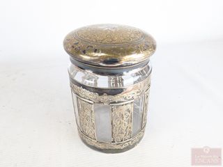 ![]() | #163 | Contenant allemand art-nouveau en métal argenté et verre, datant des années 1920 et mesurant 6.25 pouces de hauteur Contenant allemand art-nouveau en métal argenté et verre, datant des années 1920 et mesurant 6.25 pouces de hauteur | |