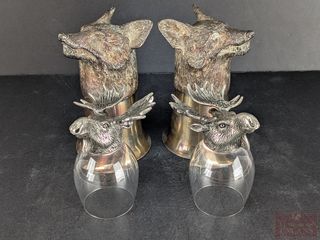 ![]() | #28 | Deux paires de gobelets en métal argenté avec motifs de renards et d'orignaux, les plus grands mesurant 4.75 pouces de hauteur Deux paires de gobelets en métal argenté avec motifs de renards et d'orignaux, les plus grands mesurant 4.75 pouces de hauteur | |