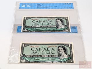 ![]() | #61 | Deux billets canadiens d'un dollar 1954 à numéros de série consécutifs, gradés CCCS UNC63 Deux billets canadiens d'un dollar 1954 à numéros de série consécutifs, gradés CCCS UNC63 | |