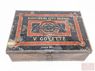 ![]() | #139 | Boite à café ou thé en métal V. Goyette, Montréal pour café et thé, datant du début du 20eme siècle et mesurant 11.25 pouces Boite à café ou thé en métal V. Goyette, Montréal pour café et thé, datant du début du 20eme siècle et mesurant 11.25 pouces | |