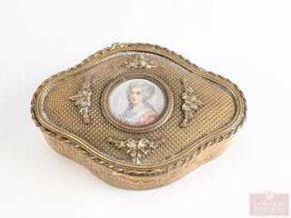 ![]() | #98 | Coffre à bijoux français de style empire, en laiton doré avec miniature peinte à la main, datant du 19eme siècle et mesurant 5 pouces Coffre à bijoux français de style empire, en laiton doré avec miniature peinte à la main, datant du 19eme siècle et mesurant 5 pouces | |