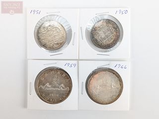 ![]() | #197 | Lot de pièces canadiennes en argent comprenant pièce d'un dollar 1959, pièce d'un dollar 1966, pièce de cinquante sous 1950 et pièce de cinquante sous 1951 Lot de pièces canadiennes en argent comprenant pièce d'un dollar 1959, pièce d'un dollar 1966, pièce de cinquante sous 1950 et pièce de cinquante sous 1951 | |