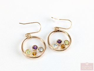 ![]() | #193 | Paire de boucles d'oreilles en or 10k serties de multiples pierres semi-précieuses, mesurant 0.5 pouces de diamètre Paire de boucles d'oreilles en or 10k serties de multiples pierres semi-précieuses, mesurant 0.5 pouces de diamètre | |