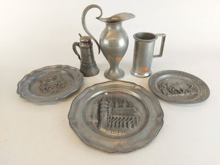 Un lot d'étain dont une jolie assiette représentant la ville de Tournai en Belgique 10 pouces de diamètre