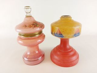 Lot varié comprenant base de lampe vintage et distributeur victorien peint à la main avec carafe et verres - 12 pouces de hauteur
