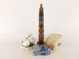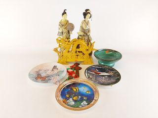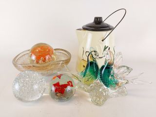 | #2 | Lot de presse-papiers et d'œuvres en verre soufflé - avec un vide poche et une jarre à biscuits en porcelaine - le couple d'oiseaux en verre mesurant 12 pouces de largeur Lot de presse-papiers et d'œuvres en verre soufflé - avec un vide poche et une jarre à biscuits en porcelaine - le couple d'oiseaux en verre mesurant 12 pouces de largeur | SOLD – CAD$ 25.00 | |