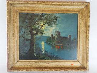 | #193 | Allan - huile sur panneau signée - Château au clair de lune - 16x20 pouces