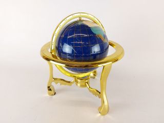 Joli globe terrestre avec incrustation de pierres variées et son support en métal - mesurant 9 pouces de hauteur