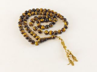| #219 | Chapelet de prière bouddhiste fait d'œil de tigre et or 18k; 15 pouces