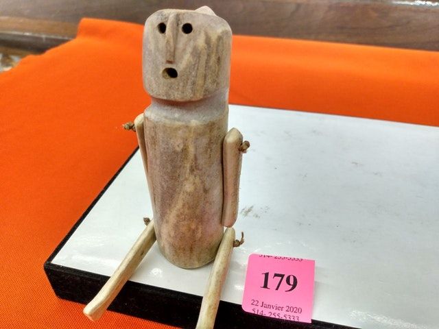 ![]() | #179 | Rare poupée articulée sculptée entièrement a la main par un artiste esquimau dans du bois de caribou avec les bras et les jambes reliés au corps grâce a du sinew tendon de caribou et servant au shaman pour les cérémonies - 5.5 pouces de longueur circa 1950,PROVENANT DE LA COLLECTION WILLY FORCATI. Rare poupée articulée sculptée entièrement a la main par un artiste esquimau dans du bois de caribou avec les bras et les jambes reliés au corps grâce a du sinew tendon de caribou et servant au shaman pour les cérémonies - 5.5 pouces de longueur circa 1950,PROVENANT DE LA COLLECTION WILLY FORCATI. | SOLD – CAD$ 140.00 |