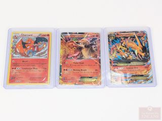 Trois cartes Pokémon Charizard 2016, Charizard EX 2016 et Mega Charizard EX 2014
