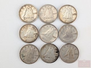 #106 Lot de pièces canadiennes de dix sous en argent, comprenant 1938, 1939, 1940, 1941, 1942, 1943, 1944, 1945 et 1946