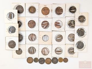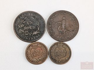 Deux pièces américaines d'un sous 1885 et 1907 Indian Head, ainsi qu'une pièce de la Nouvelle-Écosse de cinquante sous 1815 et un jeton d'un sous Bank Token Montréal