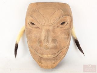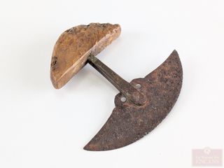 #91Rarissime et extrêmement ancien ulu inuit (période esquimaude) avec poignée en ivoire de morse fossilisée et lame en fer forgé représentant un visage, datant du 19eme siècle et mesurant 3.75x3.5 pouces, acquis lors de la fermeture d'un musée en Ontario