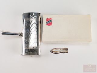 Ramasse-miette Le Grillon, fait en France et mesurant 5.75 pouces, dans sa boite d'origine, ainsi qu'un marque-page Lunt en argent mesurant 2.5 pouces de hauteur