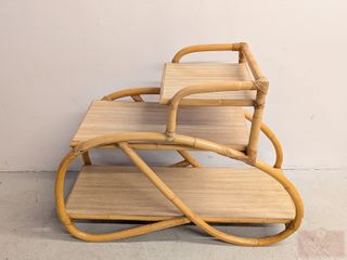 #23Table d'appoint américaine à trois niveaux en rotin, datant des années 1950 et mesurant 14.5x38.5x28 pouces
